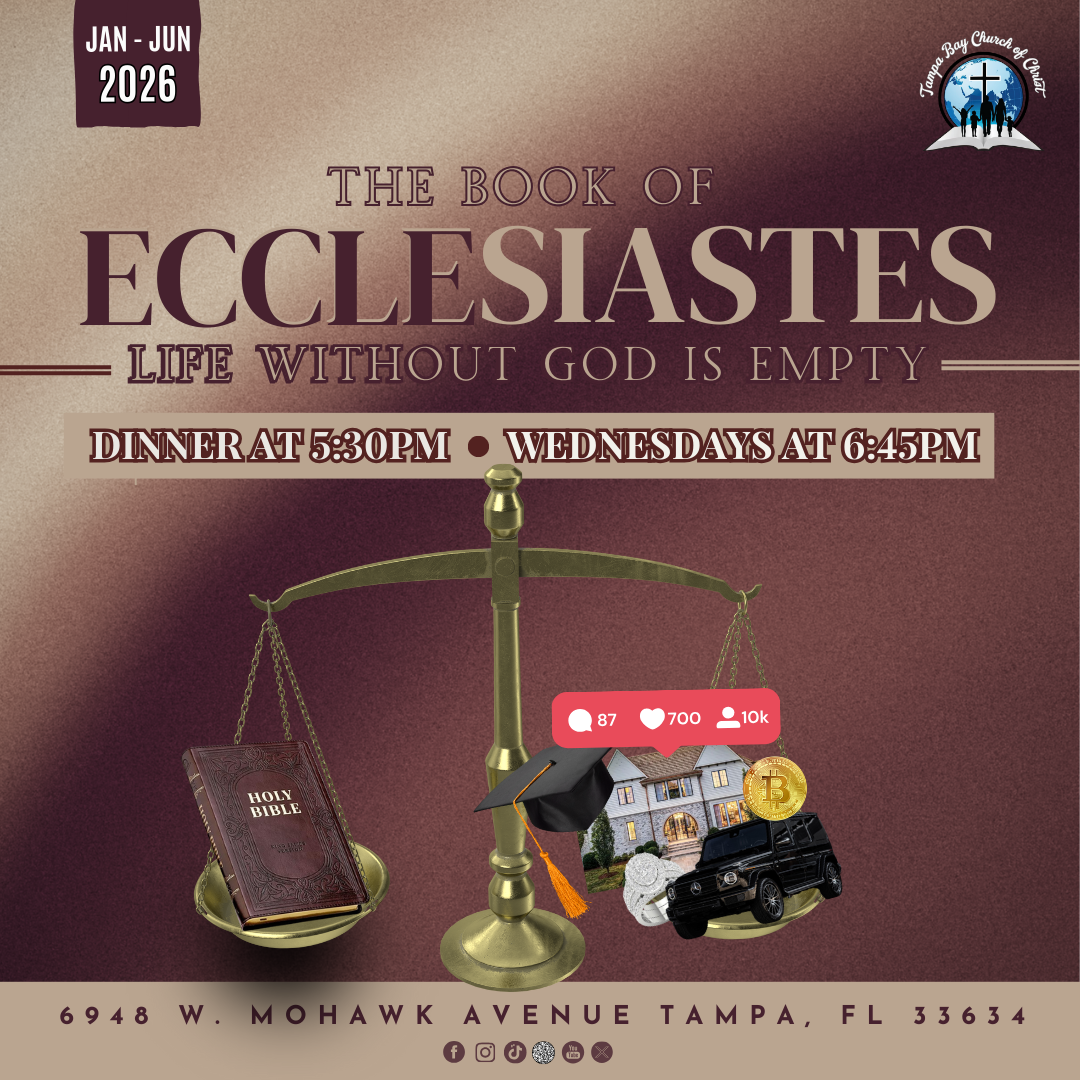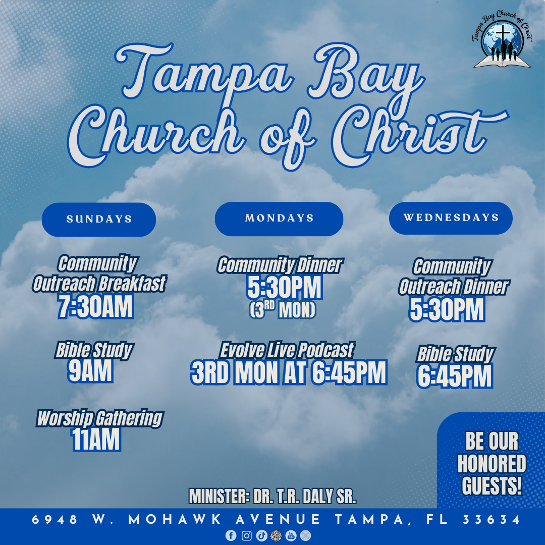 Tampa Bay Church of Christ is a family of God’s children who are saved by the grace of God and committed to serving our Lord and our fellow man. Here you will find people of all ages and from many walks of life who have been called into a united fellowship of love and acceptance. We rejoice in the precious gifts the Lord has given us, and we are eager to share those gifts and blessings with you. If you reside in Tampa, Florida and the surrounding area, please know that there is a special place for you and your family in this congregation of Christians.